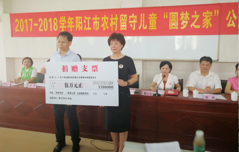 9月13日上午,由阳江市红十字会、阳江日报社、市教育局、市总工会、市妇联、市青商会联合举办的2017-2018学年阳江市农村留守儿童“圆梦之家”公益项目启动仪式在高新区大魁小学拉开帷幕。仪式由市红十字会常务副会长曾志远主持。广东广青金属科技有限公司董事长林夏苗率公司志愿者服务队参加了此次活动。